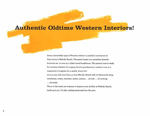 Being a good businessman, Gene promoted Melody Ranch's versatility as a motion picture and television location. Presented here is the original brochure for the ranch, circa 1955. Click on each image to enlarge it.